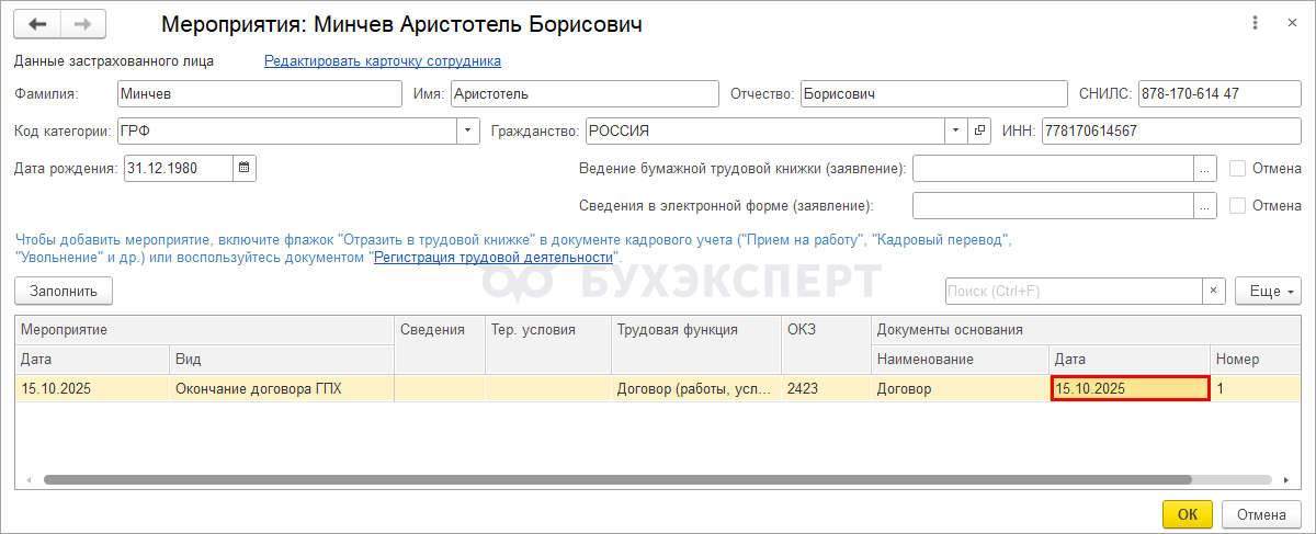 Отсчет срока для представления подраздела 1.1 ЕФС-1 начинается с даты документа-основания для мероприятия Окончание договора ГПХ.