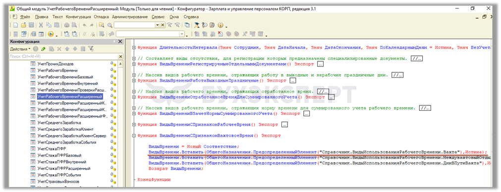 - или отключить учет вида времени «ВМ» в коде «Вахта» не дожидаясь обновления. Для этого в общем модуле УчетРабочегоВремениРасширенный в функции ВидыВремениСПризнакомВахтовоеВремя() убрать строку с видом временем Вахта. После этого нужно перепровести все документы Табель за отчетный год, где есть коды ВМ по вахтовикам