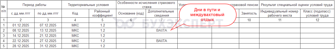 Для работы на вахте во вредных условиях труда - в графах 8 - 12 – сведения о параметрах работы во вредных условиях, дающие право на досрочное назначение пенсии