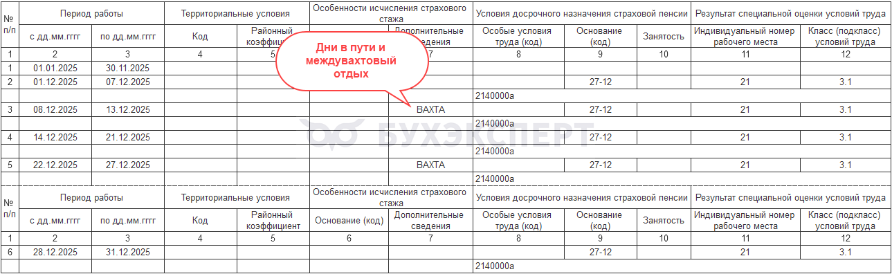 Из этого следует вывод, что если сотрудник с досрочной пенсией по вредности или с северными особенностями работает вахтовым методом, то в льготный стаж ему засчитывается не только время работы на объекте и дни в пути, но и междувахтовый отдых. То есть параметры вредных условий труда и территориальные условия указываем в том числе и для периода, отмеченного кодом ВАХТА.