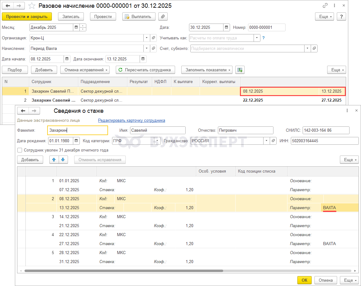 После того, как отразим «техническое» начисление документом Разовое начисление, период вахтового стажа заполнится в Сведения о страховом стаже, ЕФС-1 подраздел 1.2 с кодом ВАХТА. При заполнении документа важно обращать внимание на период в табличной части – именно он отвечает за заполнение Подраздела 1.2 ЕФС-1.
