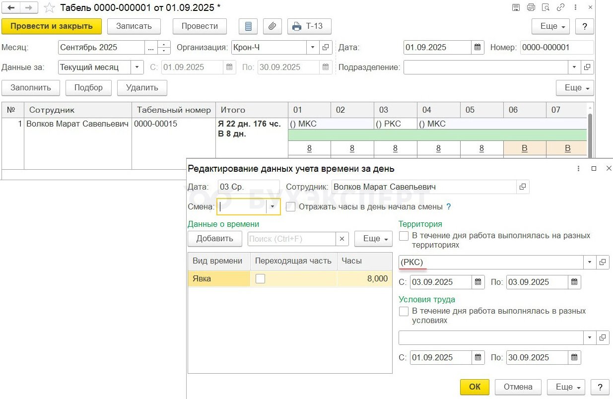 Это программная ошибка 701346939. Она проявляется, если по сотруднику работу на другой Территории отразили документом Табель и у этой Территории другой размер РК. Например, сотрудник работает в организации с РК 1,5, но 03.09.2025 он временно работал на обособленной территории с РК 1,7.
