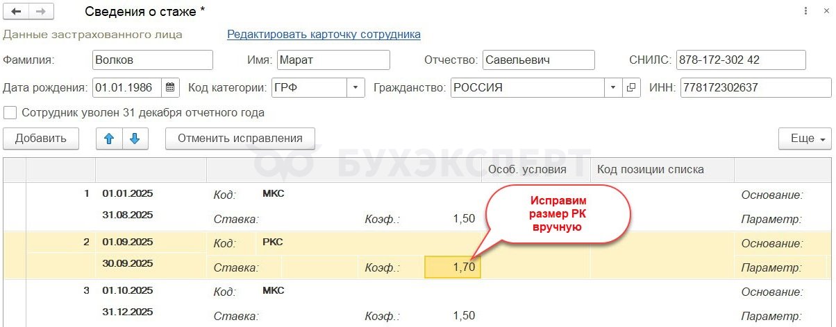 Пока ошибка не исправлена, в ЕФС-1 Подраздел 1.2 придется исправить размер районного коэффициента вручную.