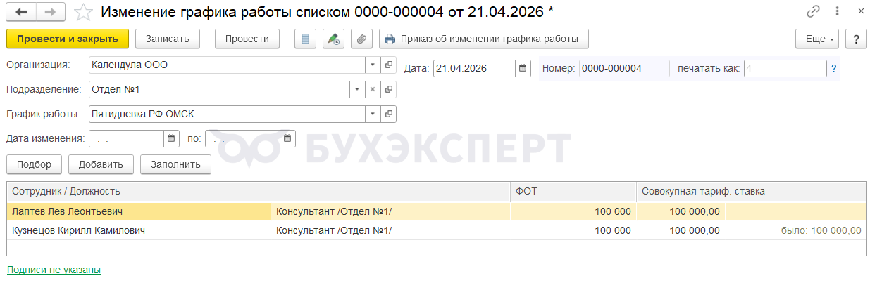 Новые графики назначаем сотрудникам документом Изменение графика работы списком (Кадры — Изменение графиков работы списком).