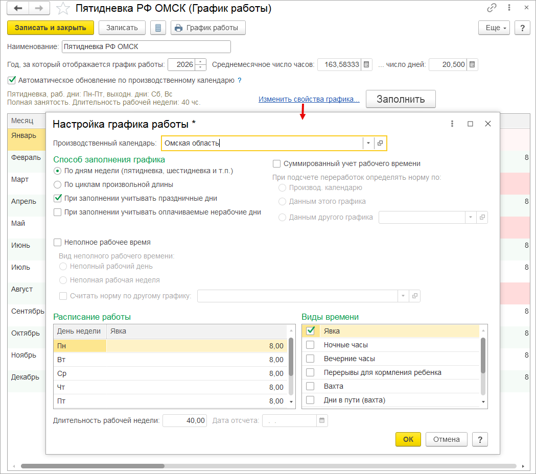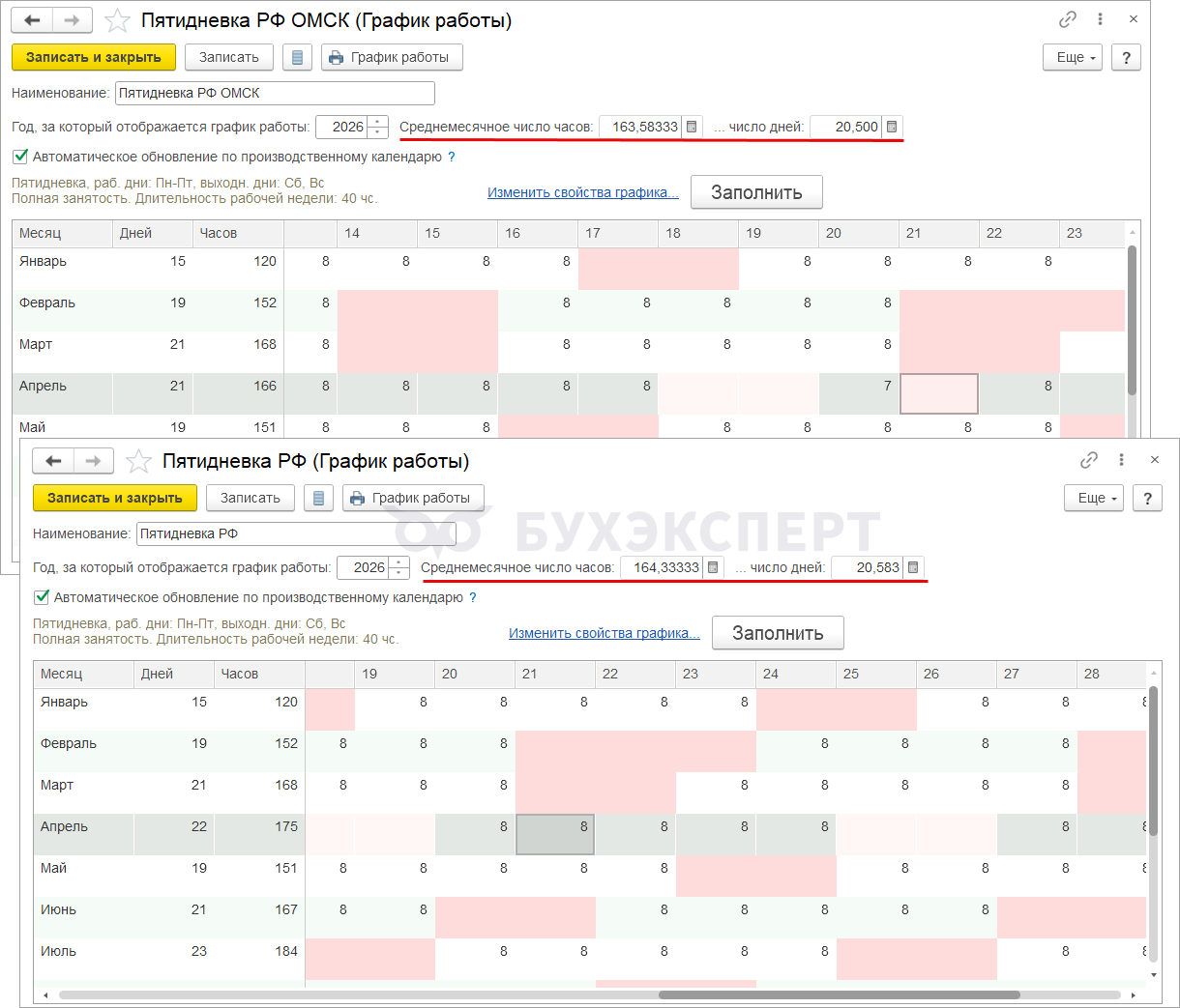 - Если перерасчет начислений из-за изменения среднемесячного числа дней и часов делать не нужно — назначаем новые графики работы с апреля 2026. Например, с 1 апреля, или с даты вступления в силу регионального акта.