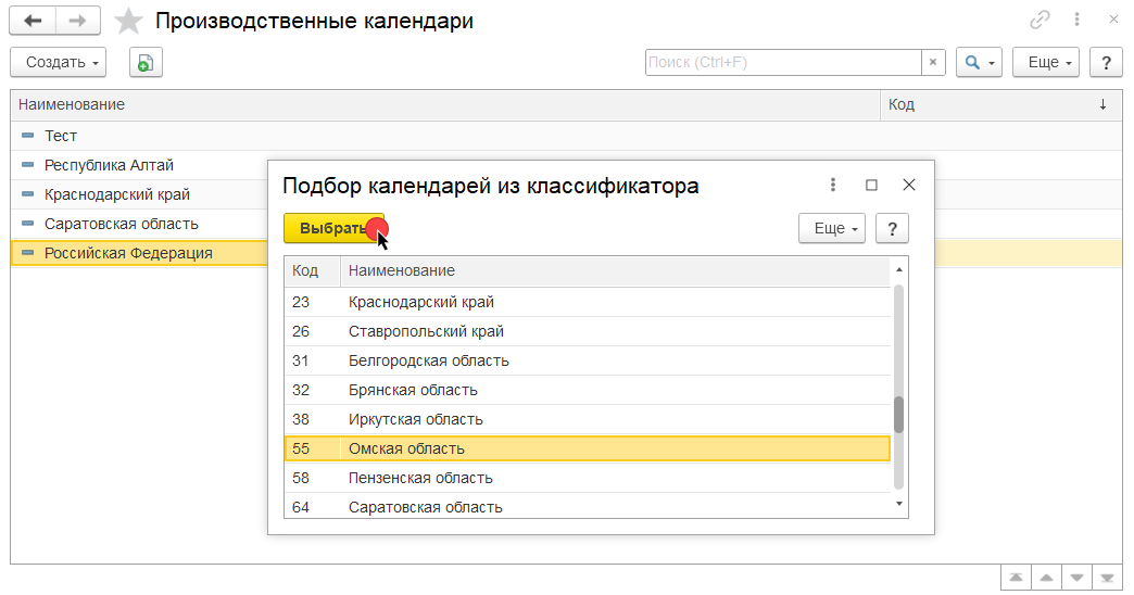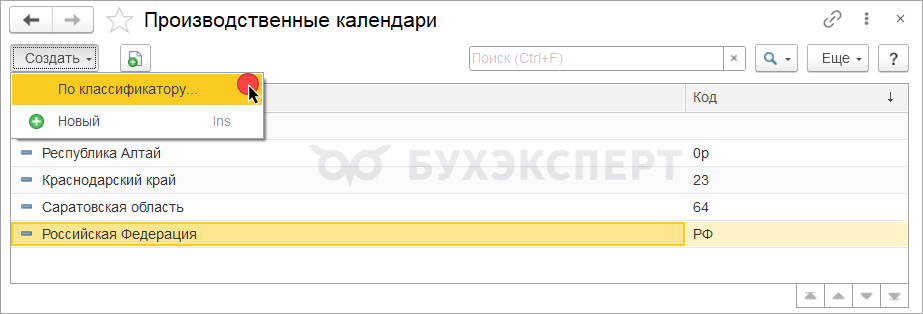 Чтобы отобразить новый региональный календарь в справочнике Производственные календари (Настройка — Предприятие — Производственные календари), нажимаем Создать — По классификатору