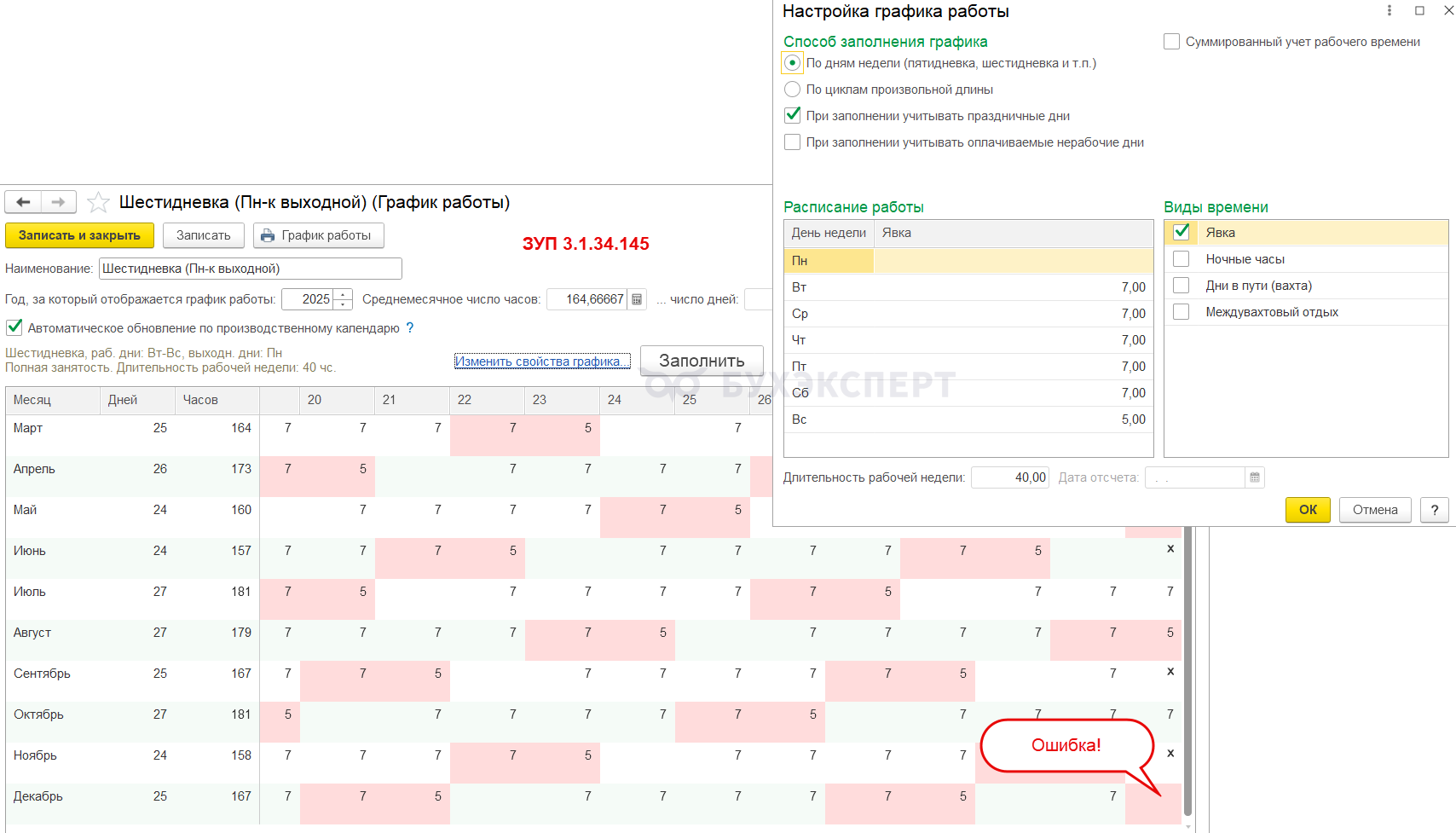 В ЗУП 3.1 на релизах 3.1.34.145 / 3.1.36.19 График работы (Настройка – Графики работы сотрудников) по календарю шестидневной рабочей недели с выходным в понедельник 31 декабря 2025 автоматически заполняется как выходной. Это неверно.