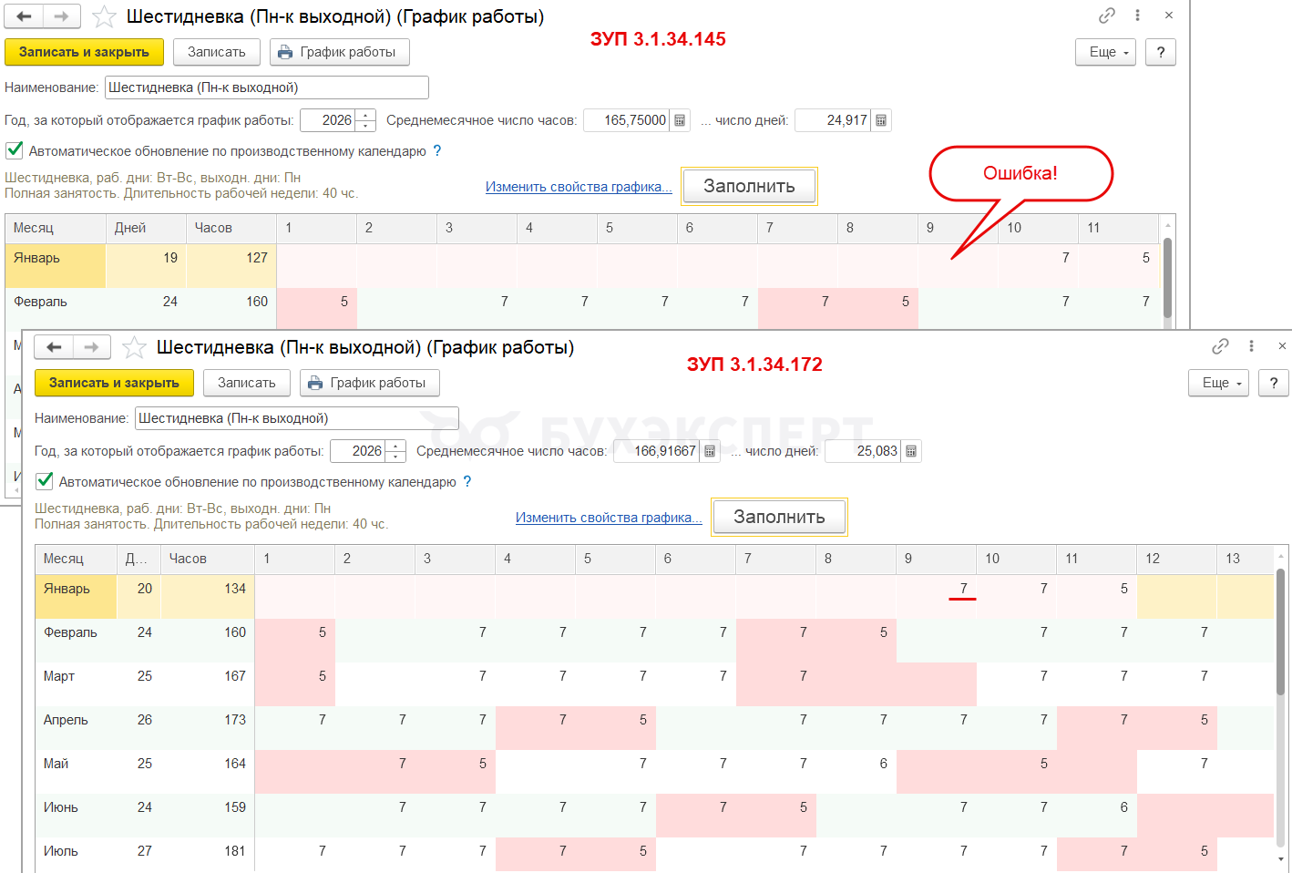 Отметим, что для ЗУП 3.1 зарегистрирована похожая исправленная ошибка по заполнению графика на 9 января 2026 года – Ошибка 70133899. При заполнении графика по шестидневке этот день отражается как выходной, а должен быть рабочим.