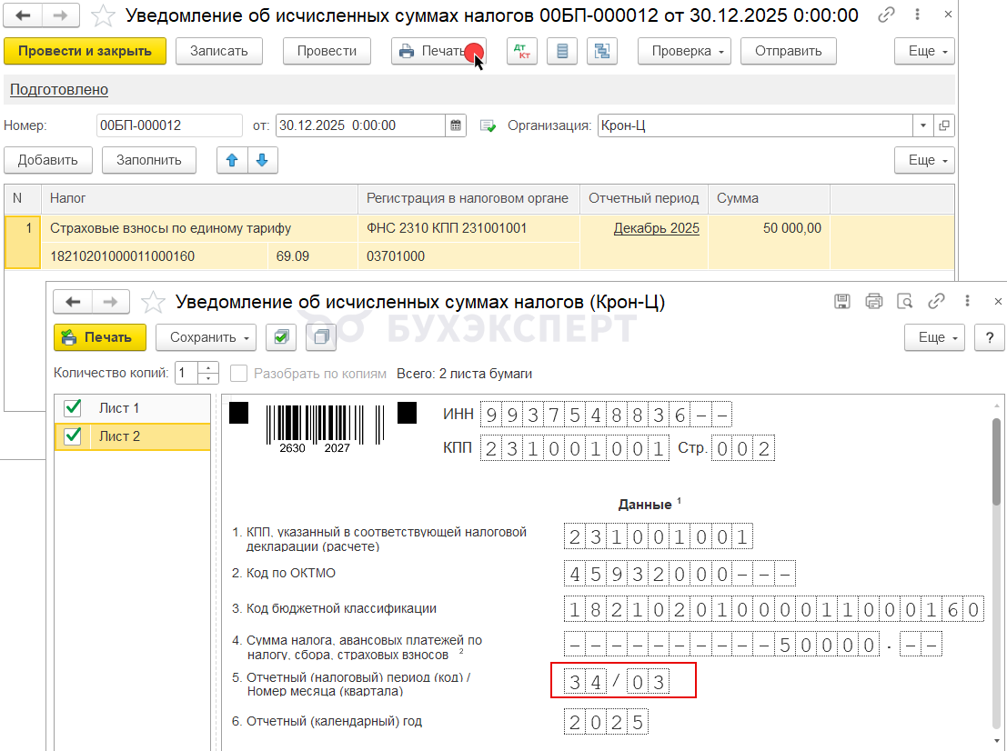 Инспекции ФНС разослали работодателям письма с просьбой представить уведомления по страховым взносам за декабрь до 31.12.2025, если взносы будут уплачены в декабре. Код периода, за который платим взносы, в уведомлении нужно указать 34/03.