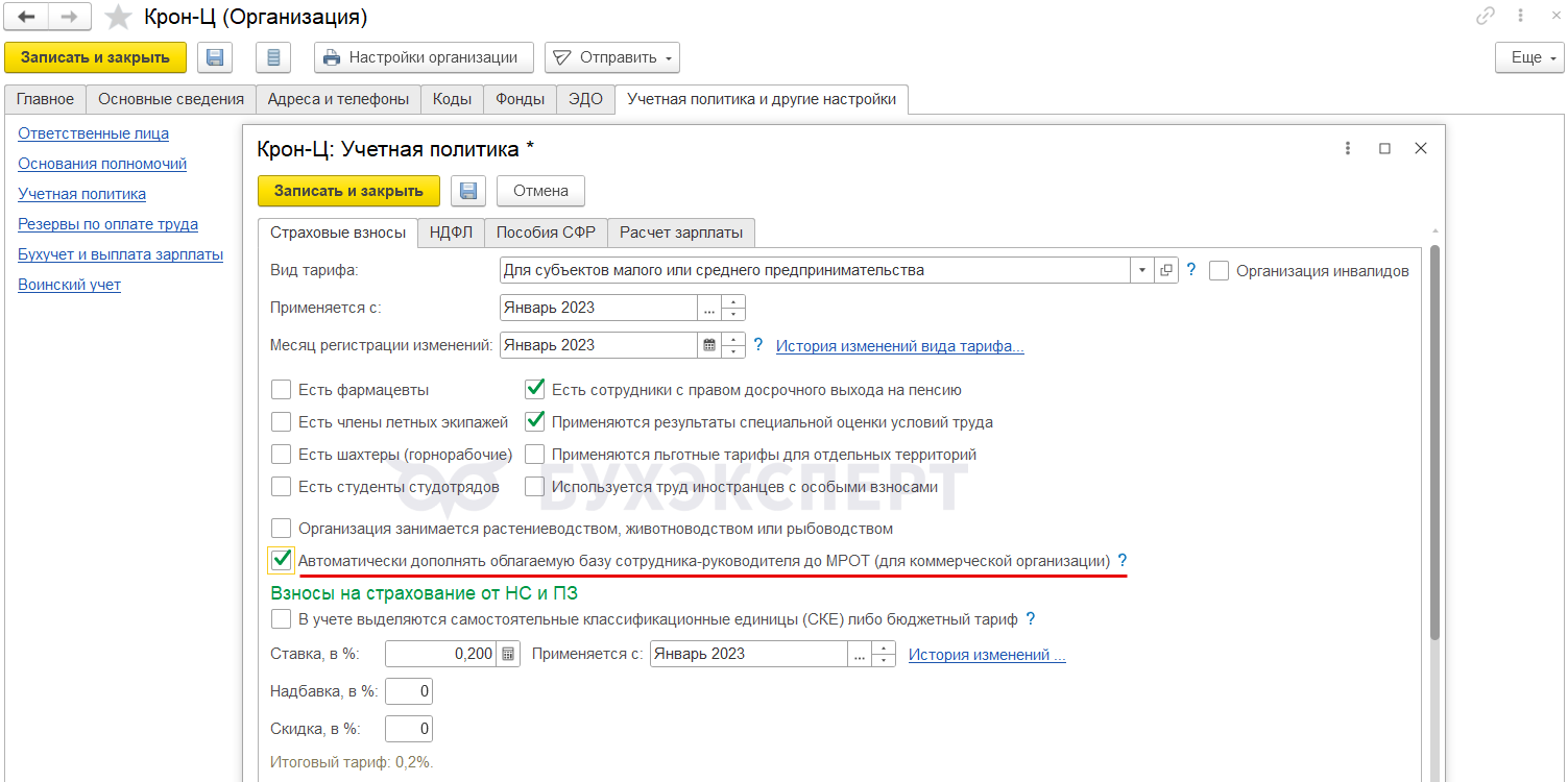 - Начисление зарплаты и взносов, если в настройках учетной политики включен флажок Автоматически дополнять облагаемую базу сотрудника-руководителя до МРОТ (для коммерческой организации) – новый функционал