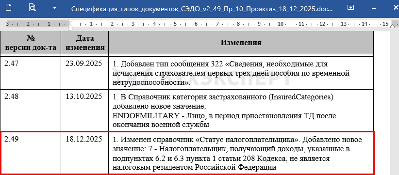 СФР разработал новую версию 2.49 спецификации типов документов СЭДО для проактивных выплат. В нее добавили новый статус налогоплательщика 7.