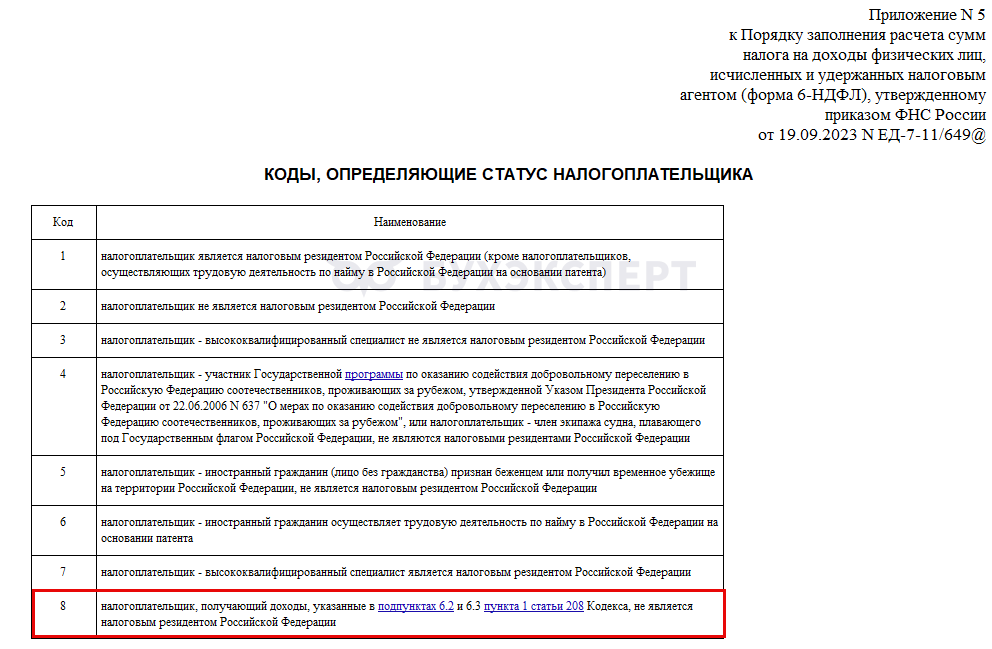 Отметим, что для отчетности по НДФЛ по таким сотрудникам Приказом ФНС от 19.09.2023 N ЕД-7-11/649@ установлен код 8.