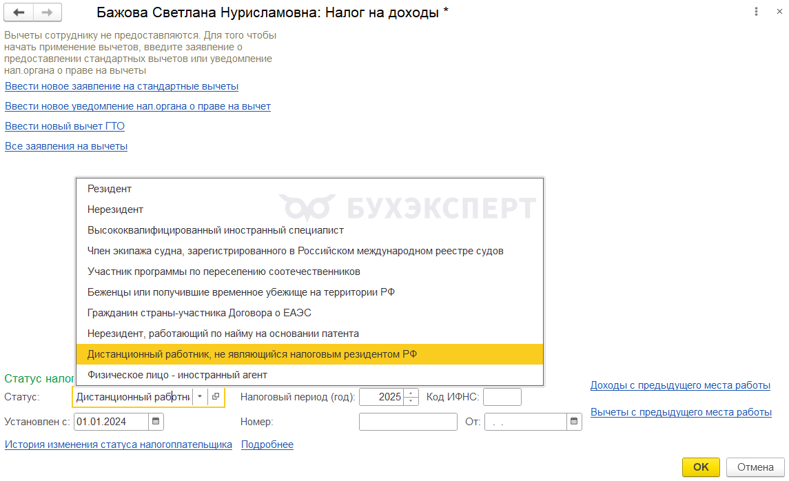 В ЗУП 3.1 заграничным дистанционным работникам соответствует статус Дистанционный работник, не являющийся налоговым резидентом РФ