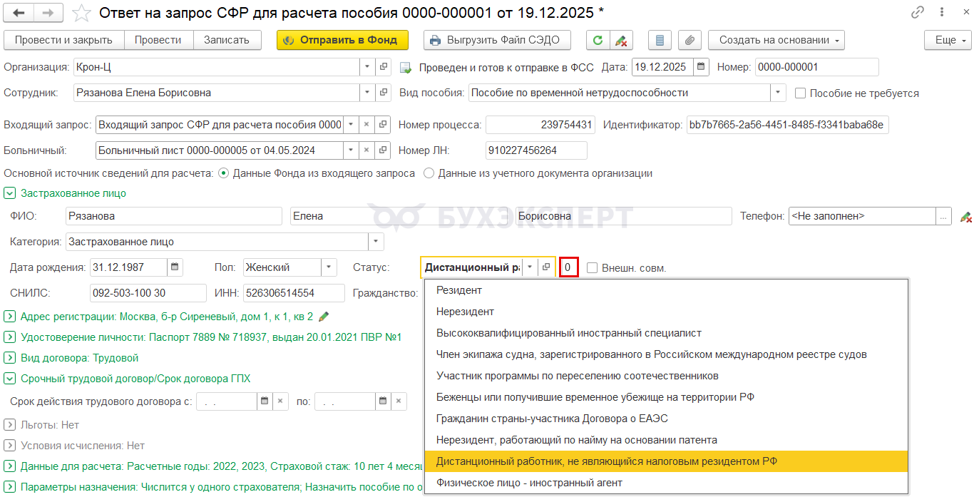 Статусы СФР указываются во Входящих запросах СФР и Ответах на запросы (Кадры — Пособия). Подробнее — Статус НДФЛ в документах СЭДО