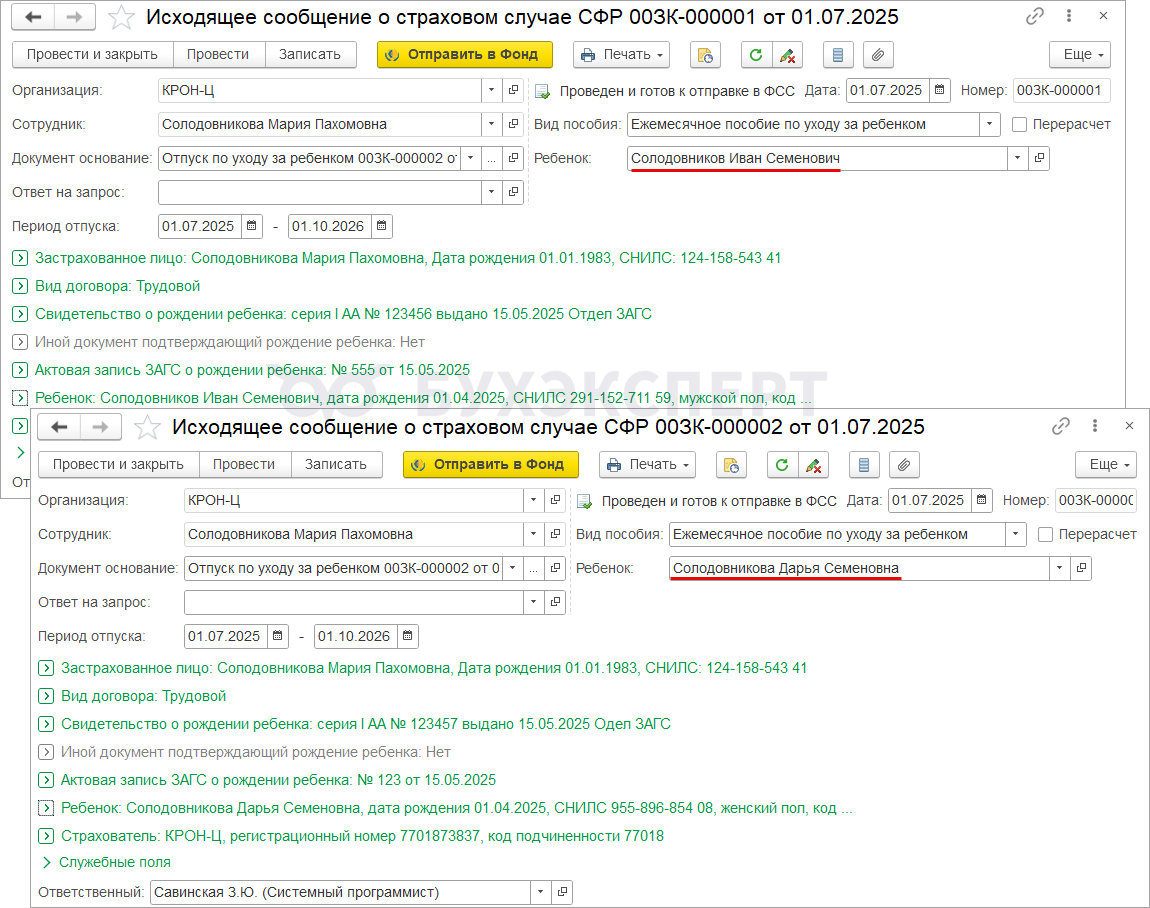 При этом по каждому ребенку отправляем отдельное Исходящее сообщение о страховом случае (Кадры – Пособия).