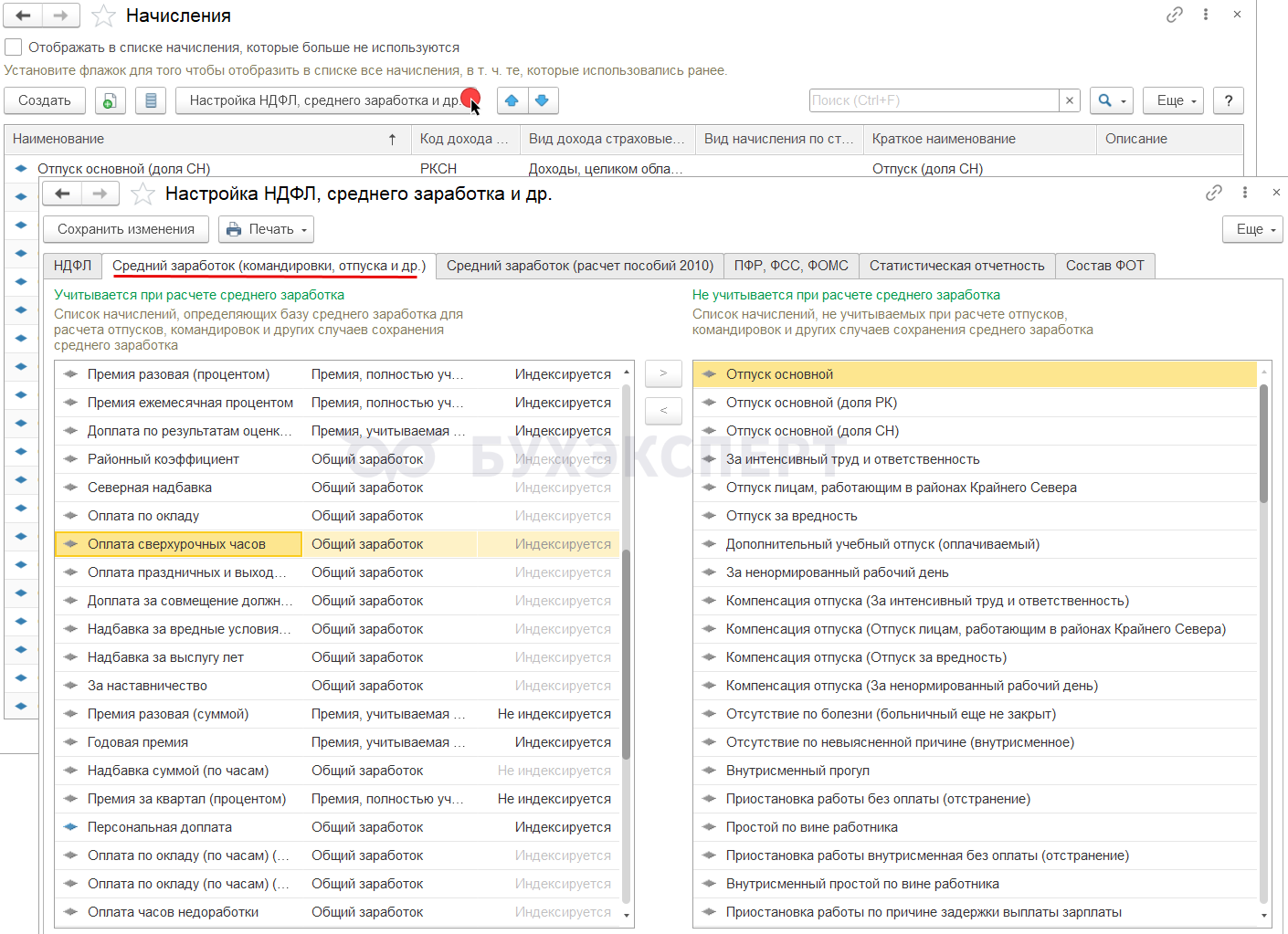Увидеть, какие виды начислений входят в расчет среднего в вашей базе, можно в списке начислений (Настройка – Начисления) по кнопке Настройка НДФЛ, среднего заработка и др.