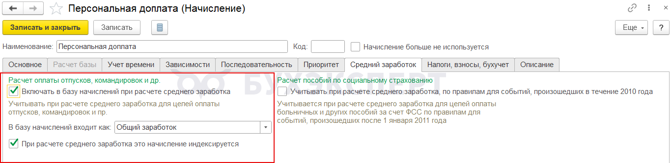 Для некоторых начислений порядок вхождения в средний можно переопределить. Для этого в настройках начисления предназначена вкладка Средний заработок — Расчетная база для расчета среднего заработка в ЗУП 3.1.