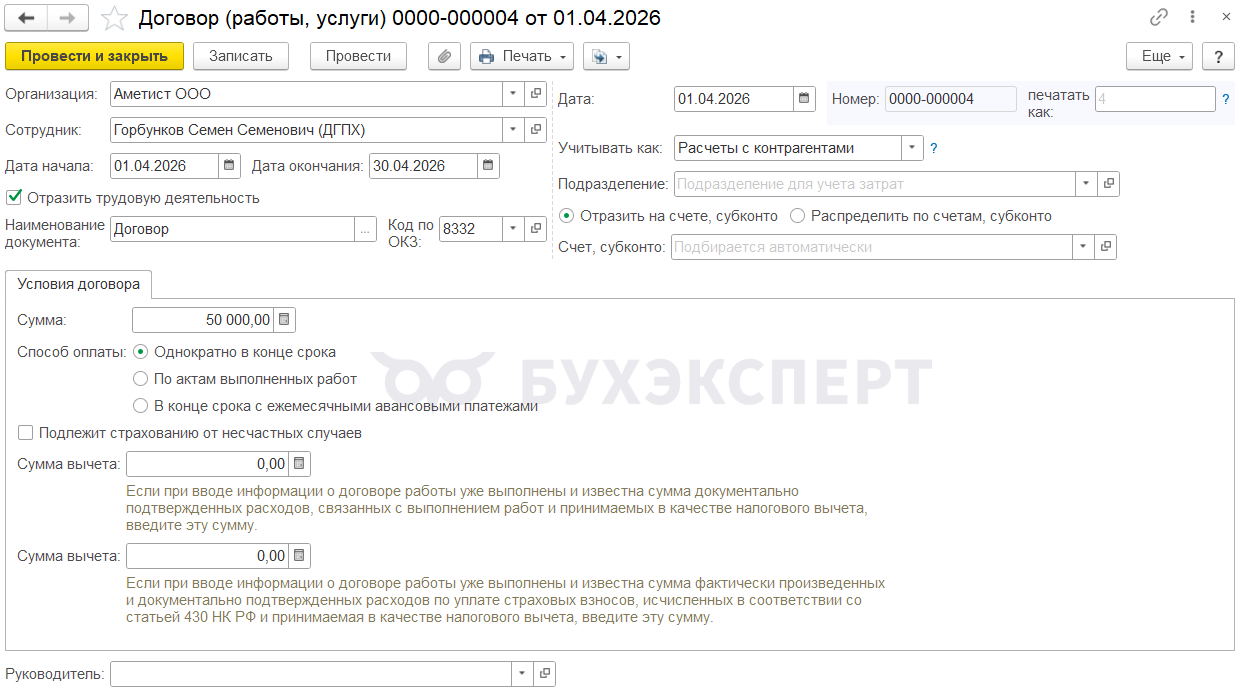 Если с ИП заключили договор на оказание услуг (выполнение работ) которые не относятся к видам деятельности ИП — чтобы соблюсти требование Минфина, в ЗУП 3.1 регистрируем Договор ГПХ как с обычным физическим лицом. Для этого применяем документ Договор (работы, услуги) (Зарплата – Договоры (в т. ч. авторские)) — Учет договоров ГПХ.