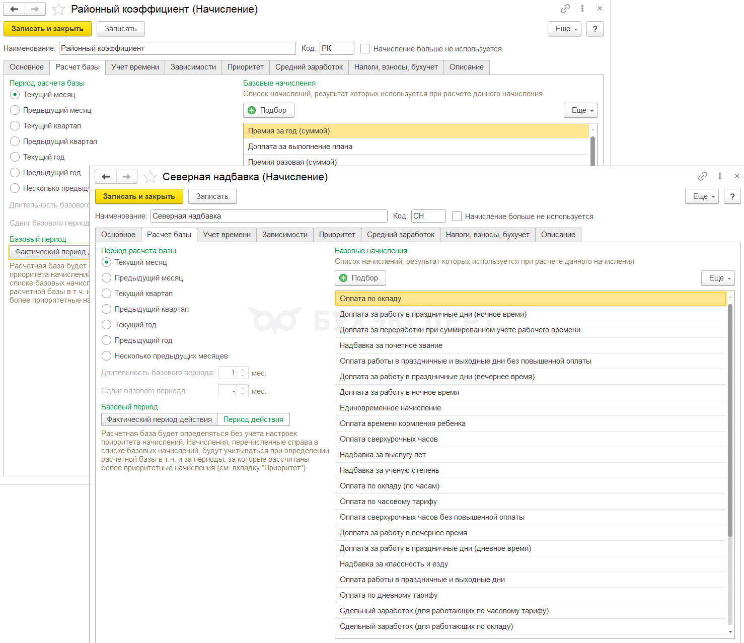 В ЗУП 3.1 для расчета северной надбавки и районного коэффициента предусмотрены типовые виды начислений Районный коэффициент и Северная надбавка (Настройка – Начисления). На вкладке Расчет базы для них по умолчанию уже задан список выплат, на которые они начисляются. Список совпадает с рекомендациями, которые дает Роструд.