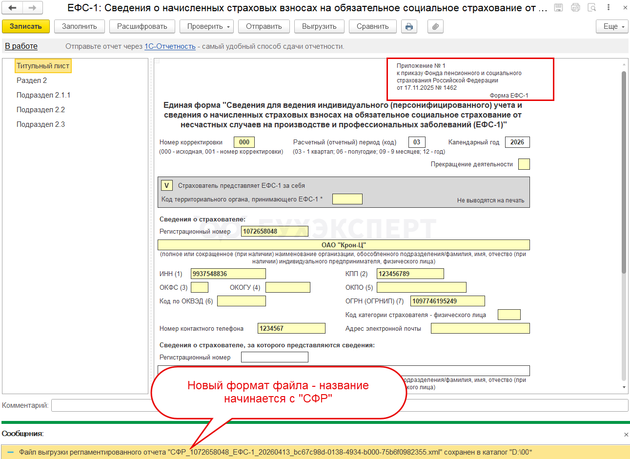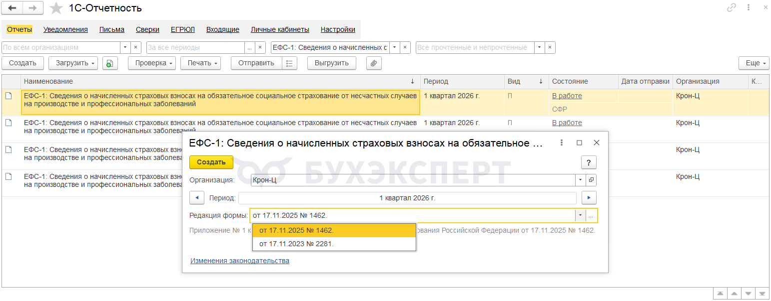 При выборе редакции по Приказу СФР от 17.11.2025 N 1462 программа заполнит отчет по новой форме. Файл выгрузки для нее будет формироваться в новом формате.