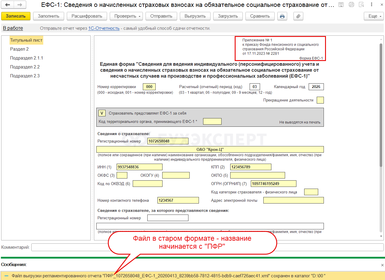 При выборе варианта по Приказу СФР от 17.11.2023 N 2281 сформируется прежняя форма отчета и файл выгрузится в старом формате.