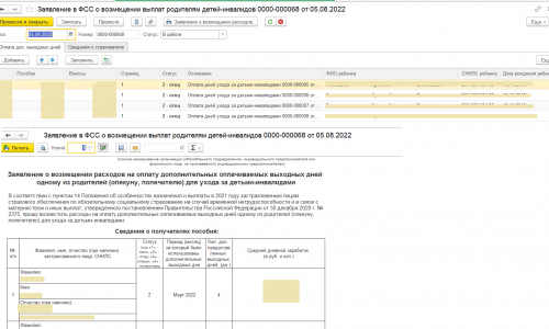 Новые формы начнут применяться с 30 июля 2022 (Приказ ФСС от 13.05.2022 N 185). Форма появилась в релизах ЗУП 3.1.18.546 / 3.1.23.20 — Новая форма заявления о возмещении расходов на оплату дополнительных выходных для ухода за детьми-инвалидами (ЗУП 3.1.18.546 / 3.1.23.20).
