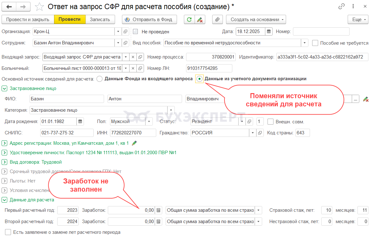 - В Ответе на запрос СФР меняем источник среднего и указываем Данные из учетного документа организации. После этого в разделе Данные для расчета пропадает заработок