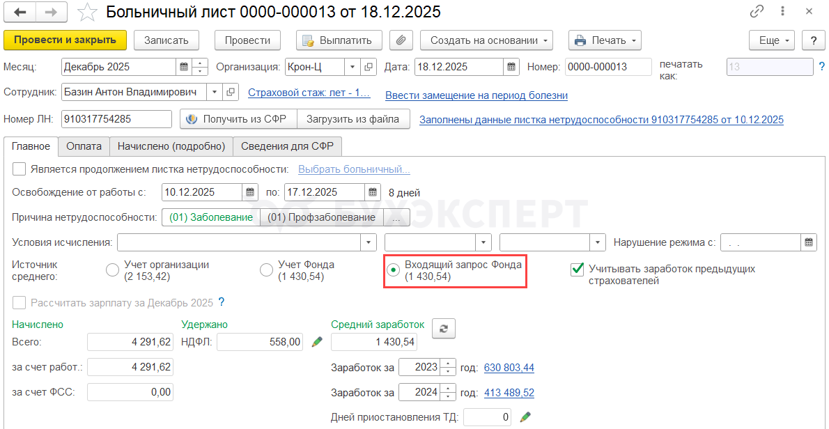 - В Больничном листе в качестве источника среднего выбран Входящий запрос Фонда