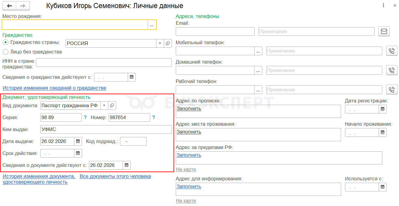 • Принимаем на работу сотрудника. По ссылке Личные данные вносим данные паспорта