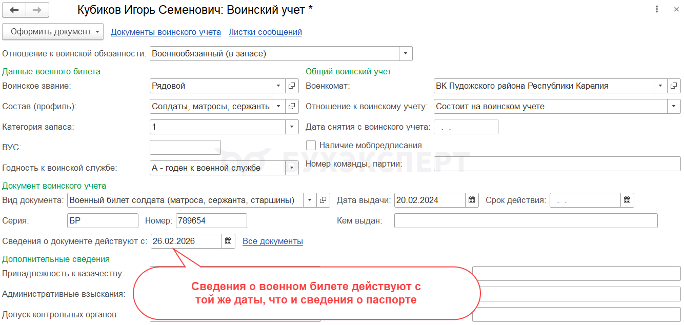• После этого по ссылке Воинский учет в карточке сотрудника вносим сведения о военном билете. Дата начала действия сведений о военном билете совпадает с датой начала действия сведений о паспорте