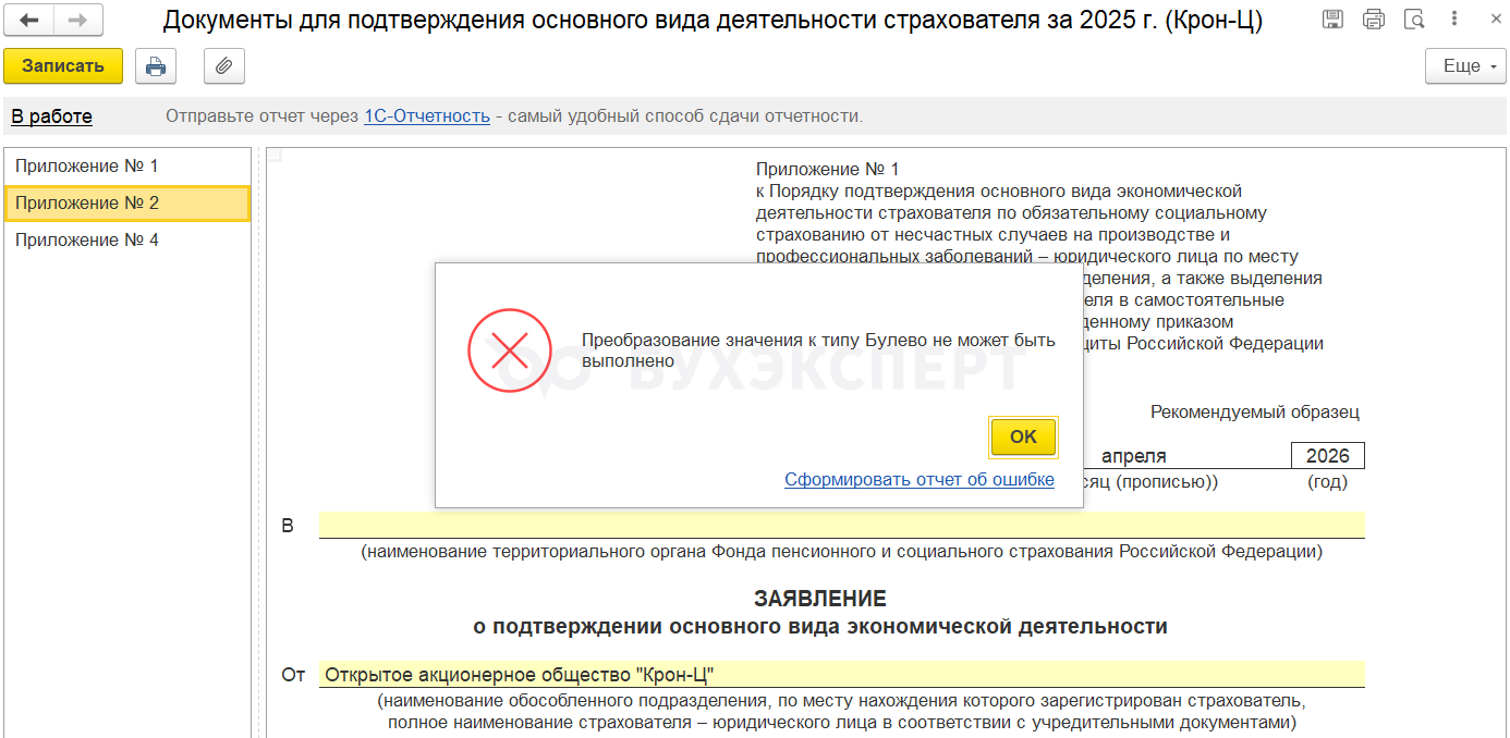 В ЗУП 3.1 обнаружена ошибка – при создании отчета Подтверждение вида деятельности (Отчетность, справки – 1С-Отчетность) возникает ошибка «Преобразование значения к типу Булево не может быть выполнено».