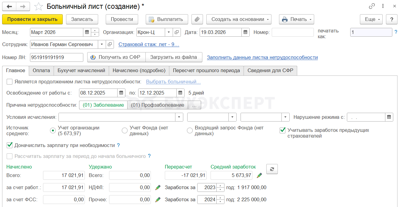 - После установки патча перепроводим документ Больничный лист. В нашем примере сумма пособия не поменялась, поэтому теперь документ Больничный лист не будет формировать движений в налоговом учете – это правильно