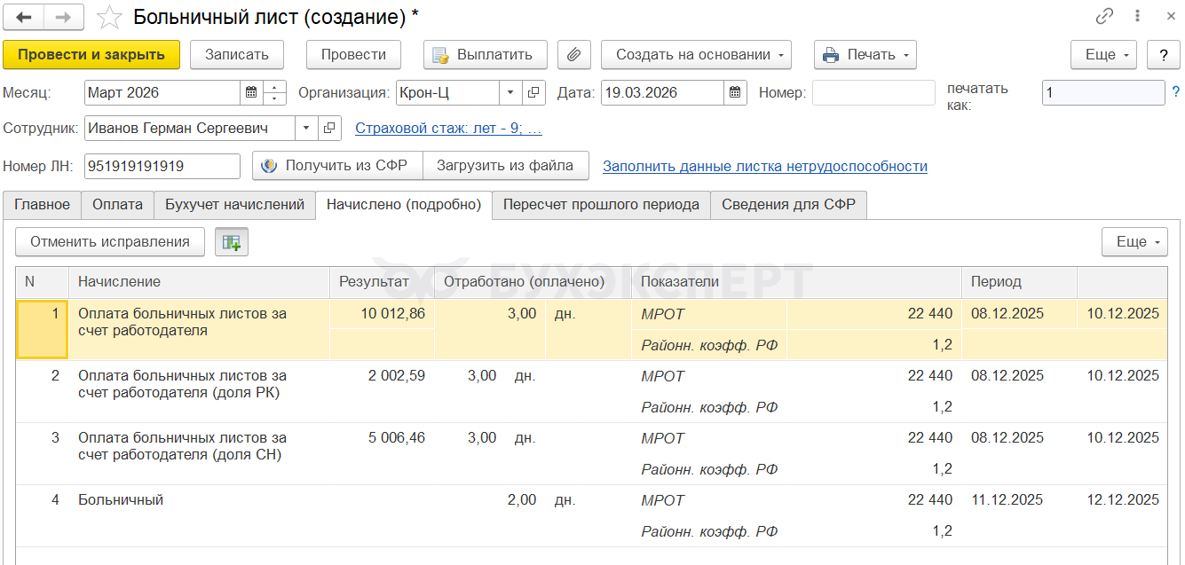 В этом случае в Больничном листе на вкладке Начислено (подробно) выделяются доли РК и СН с пособия.