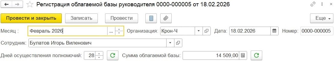 • В документе Регистрация облагаемой базы руководителя регистрируем сумму облагаемой базы, недостающей до МРОТ