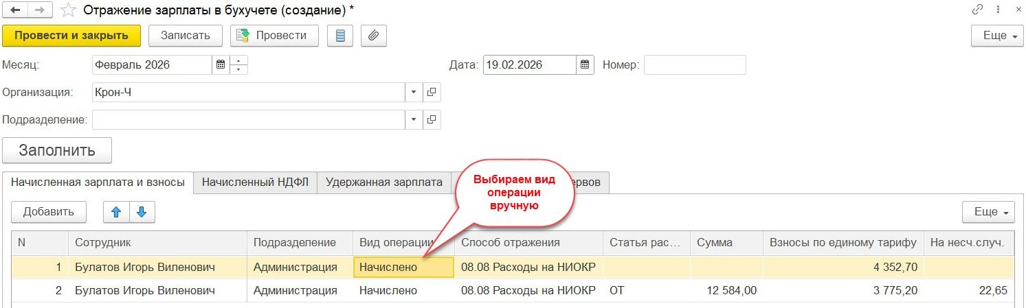 Пока ошибка не исправлена, заполняем поле Вид операции вручную – выбираем значение Начислено.
