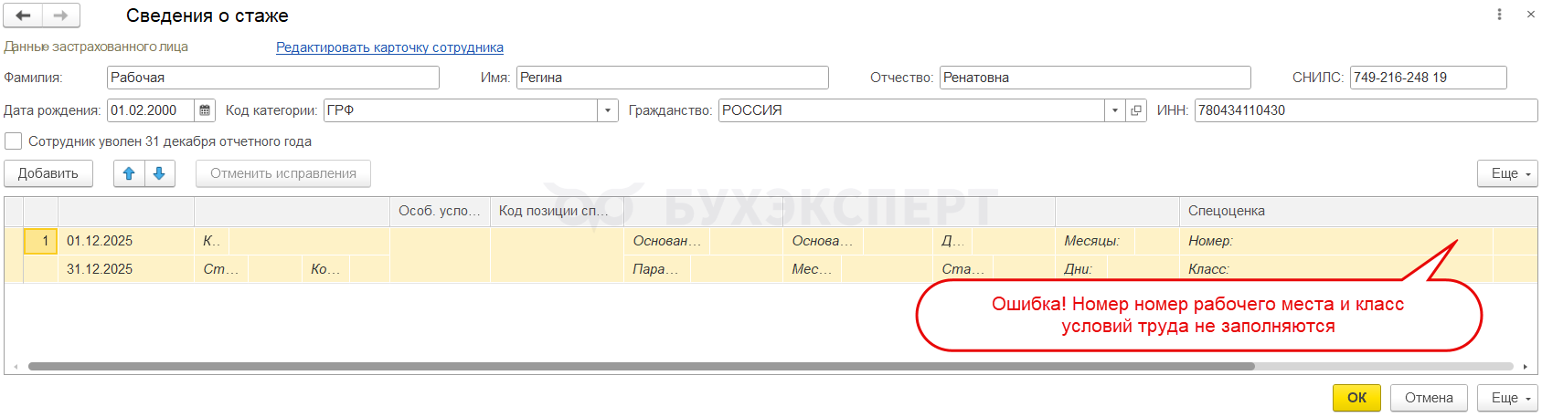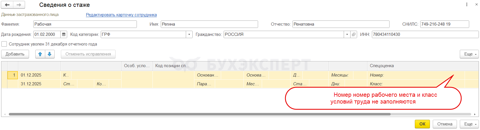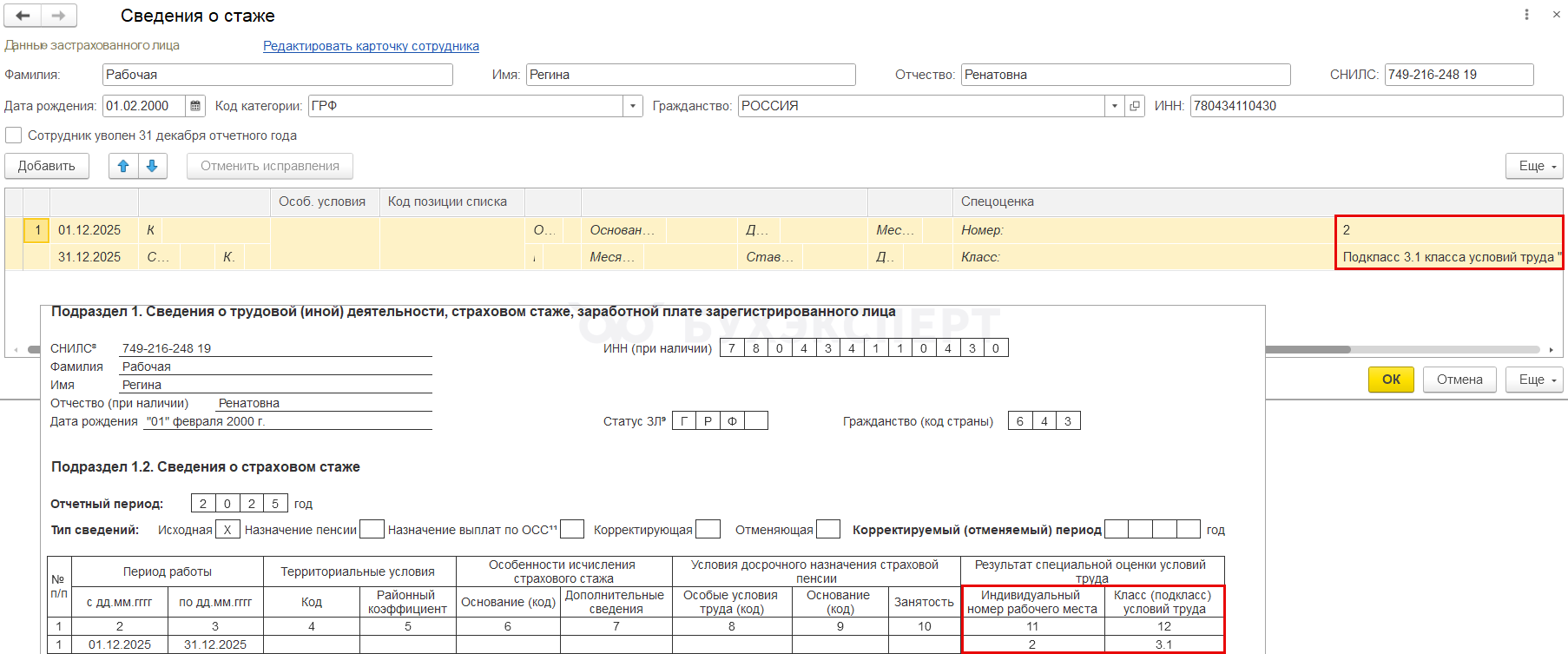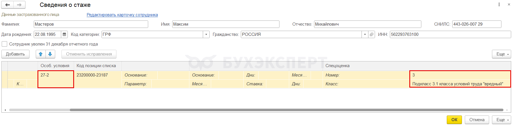 После установки патча, поля с номером рабочего места и классом условия труда будут автоматически заполняться в Сведениях о стаже независимо от значения поля Особые условия труда.