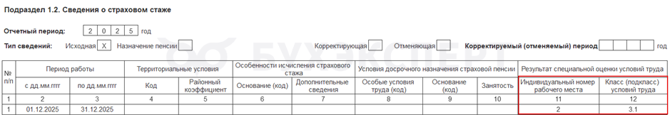 Согласно Приказу СФР от 17.11.2025 N 1462, в подразделе 1.2 ЕФС-1 за 2025 год номер рабочего места и класс условий обязательны к заполнению, если по результатам спецоценки рабочему месту присвоен вредный или опасный класс условий труда (п. 106 Приказа). Входит ли при этом должность в списки льготных профессий, не важно.