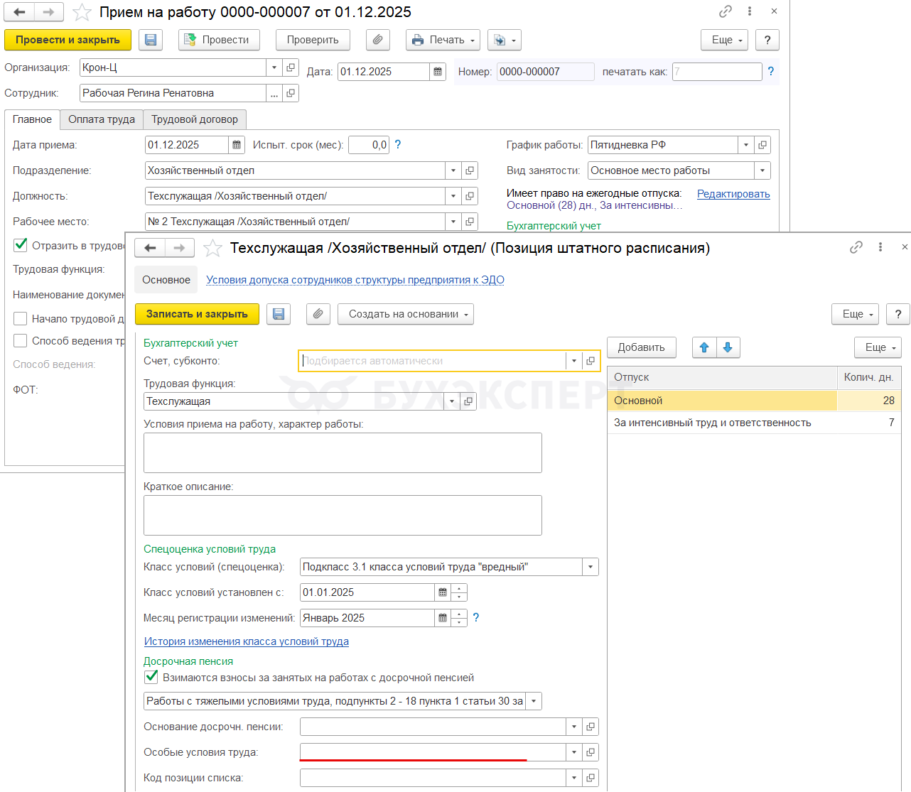 Однако в ЗУП 3.1 в документе Сведения о стаже, подраздел 1.2 ЕФС-1 (Отчетность, справки — СФР. Пачки, реестры, описи) класс условий труда и номер рабочего места заполнятся, только если для должности (позиции штатного расписания или рабочего места) заполнено поле Особые условия труда.