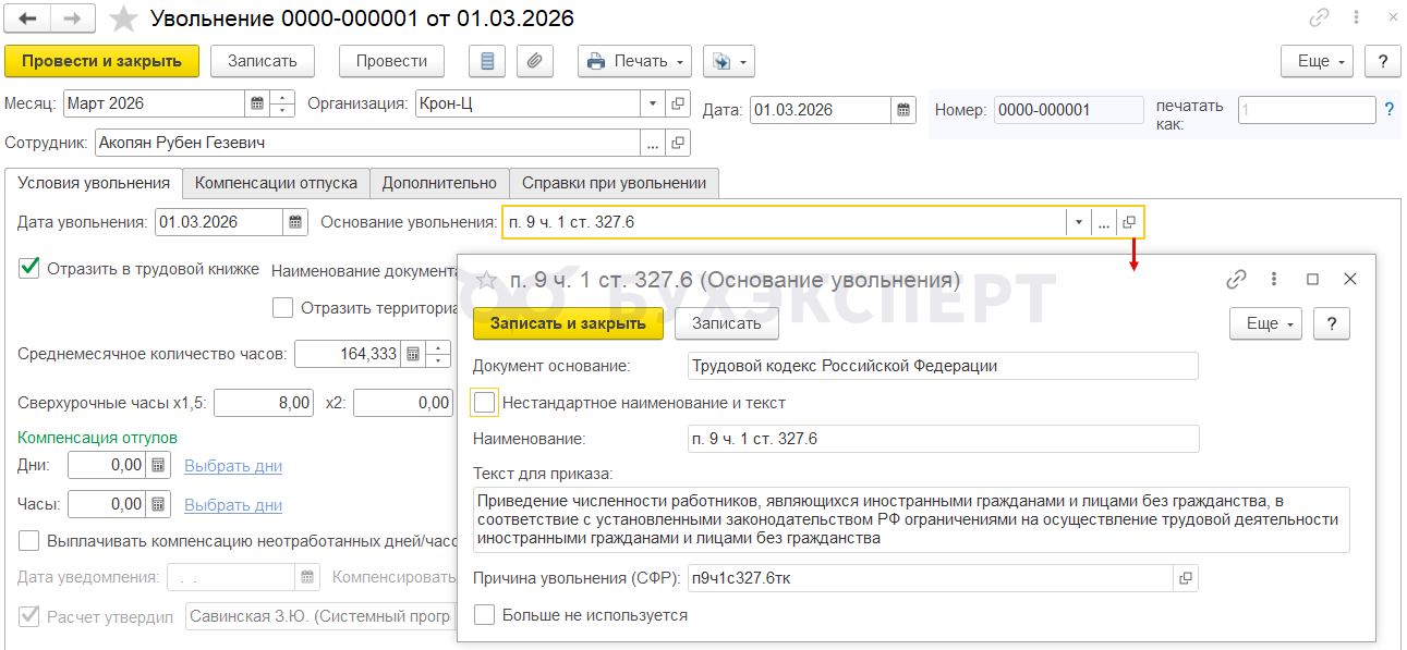 В текущих релизах ЗУП 3.1 для основания увольнения по п. 9 ст. 327.6 ТК РФ по сравнению с текстом новой редакции ТК РФ используется более универсальная формулировка – с отсылкой к законодательству РФ.