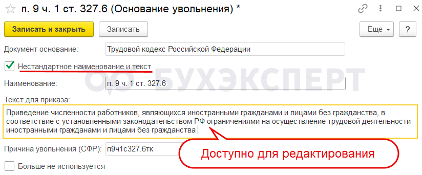 Если к моменту увольнения по новому основанию разработчики ее не изменят — то чтобы применить точную формулировку по ТК РФ, поле Текст приказа можно будет отредактировать вручную.