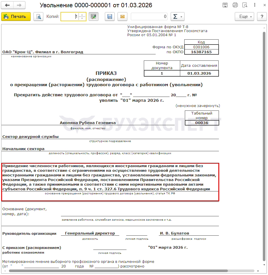 Тогда в печатную форму приказа на увольнение подтянется новая формулировка.