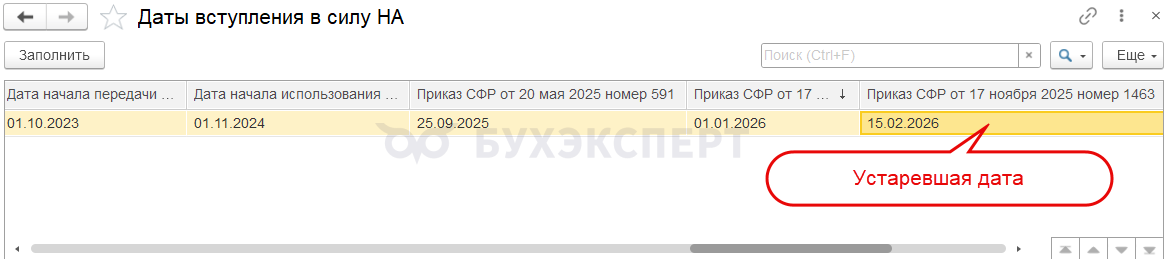 Если столкнетесь с такой проблемой, проверьте дату в регистре Даты вступления в силу НА в колонке Приказ СФР от 17 ноября 2025 номер 1463. Скорее всего, там указана дата более ранняя дата, чем та, на которую формируем ЕФС-1. Например, если заполняем отчет 16 февраля, дата в регистре указана 15 февраля или ранее. Также дата вообще может быть не заполнена.