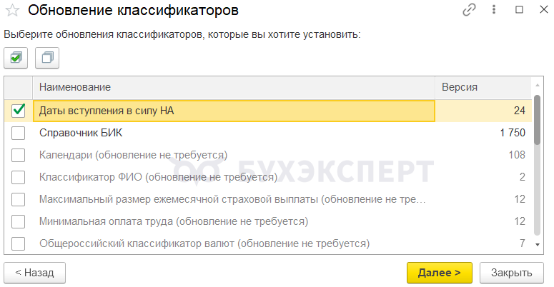 В окне выбора отмечаем флажком классификатор Даты вступления в силу НА и производим обновление.