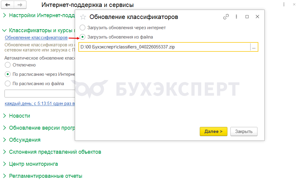 Обновить классификатор может пользователь с правами администратора. Для этого заходим в раздел Администрирование – Интернет-поддержка и сервисы — Классификаторы и курсы валют — Обновление классификаторов.