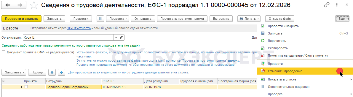 Чтобы после обновления регистра сформировать ЕФС-1 в старом формате, отменяем проведение документа и проводим его повторно.