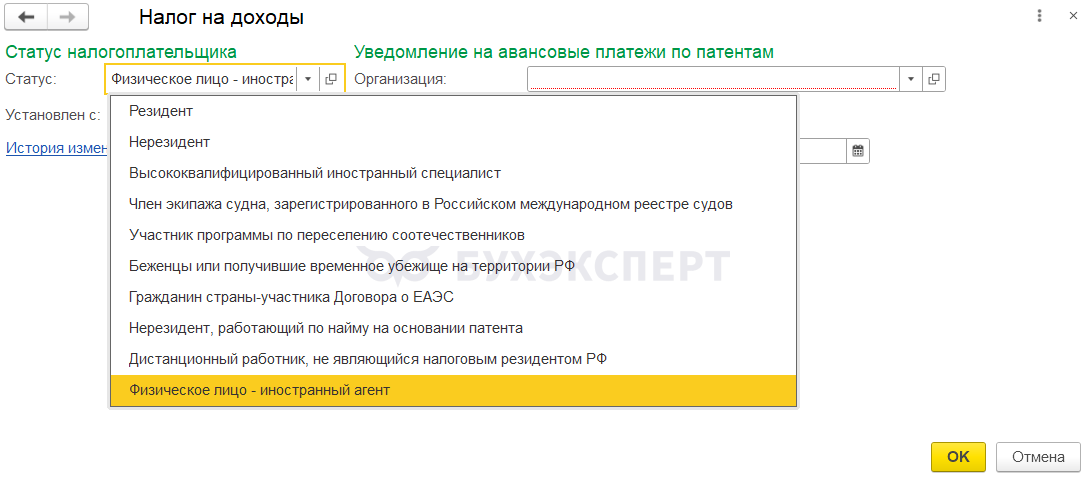 Несмотря на то, что изменение в программах 1C разработчики не анонсировали, в релизах ЗУП 3.1.34.172 / 3.1.36.39 появился новый статус налогоплательщика по НДФЛ Физическое лицо – иностранный агент