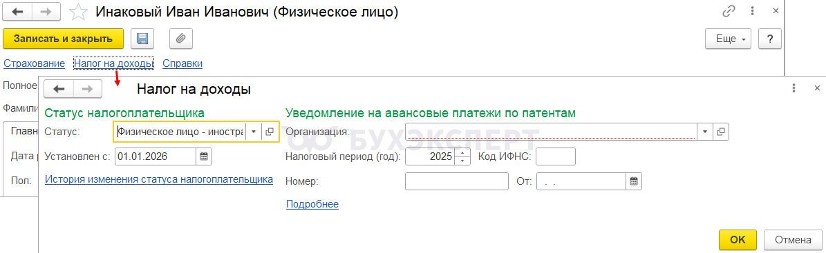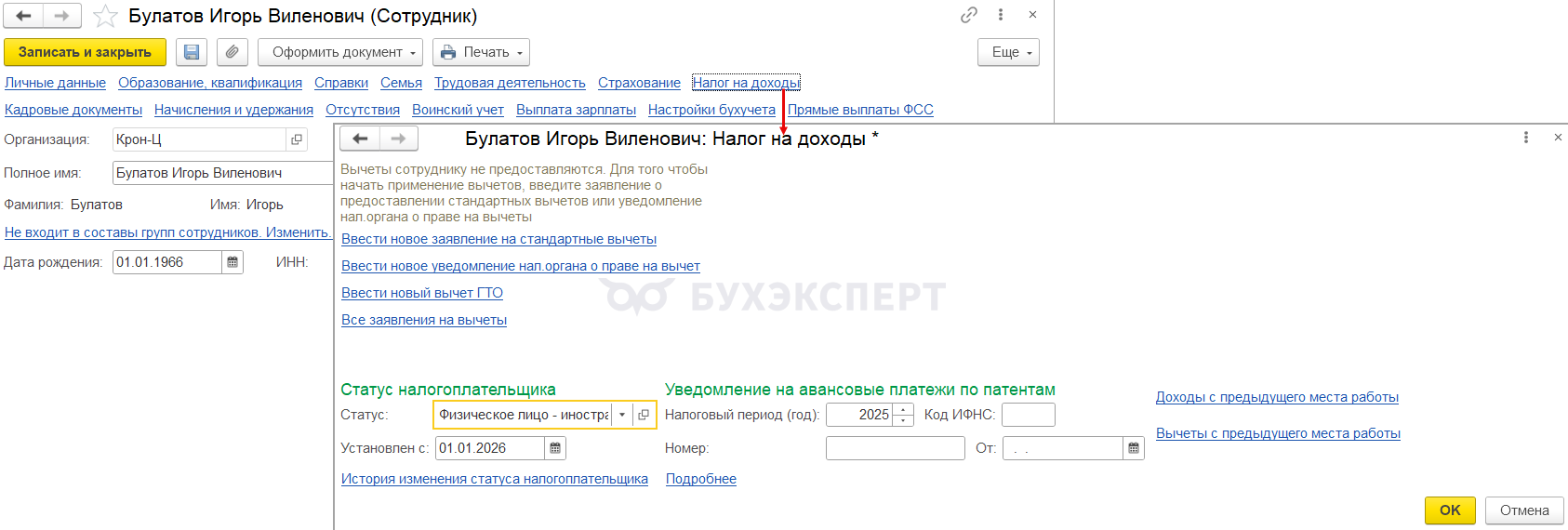 Статус налогоплательщика в ЗУП 3.1 задается: