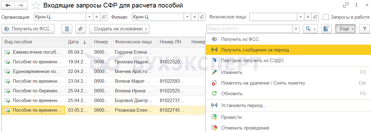 Когда нет уверенности, что все сообщения СЭДО поступили в ЗУП 3.1, можно попробовать повторно загрузить сообщения за выбранный период. Для этого в списке документов Входящие запросы СФР для расчета пособия (Кадры – Пособия) нажимаем Еще – Получить сообщения за период.