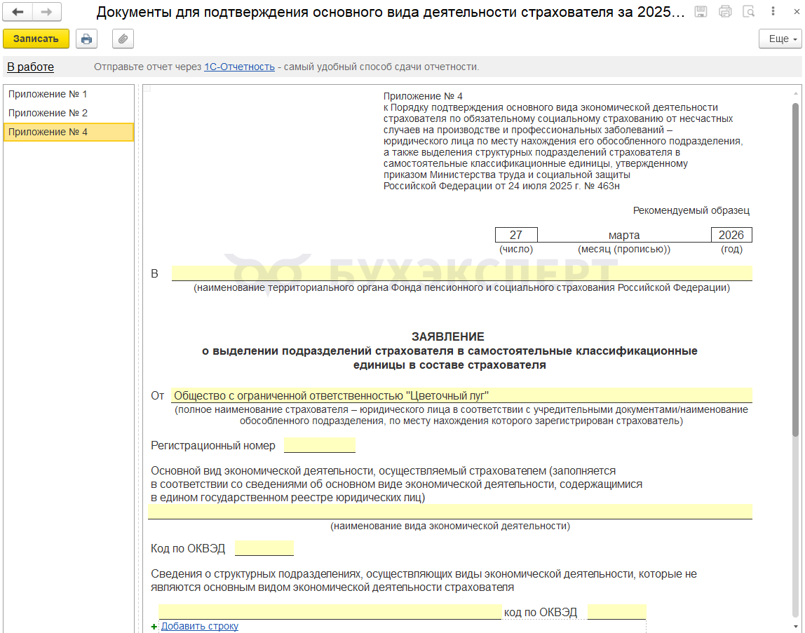 В ЗУП 3.1 заявление о выделении подразделений страхователя в СКЕ можно сформировать в рабочем месте 1С-Отчетность (Отчетность, справки – 1С-Отчтетность – Отчетность в фонды – Подтверждение вида деятельности). Документ заполняется вручную.