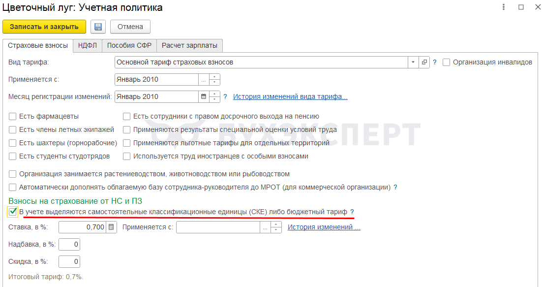 Чтобы в ЗУП 3.1 появилась возможность начислять взносы по СКЕ, в настройках Учетной политики организации на вкладке Страховые взносы нужно установить флажок В учете выделяются самостоятельные классификационные единицы (СКЕ) либо бюджетный тариф СКЕ для взносов от несчастных случаев